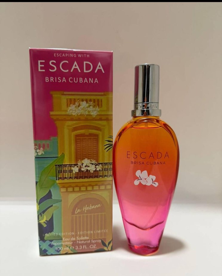 Escada Brisa Cubana kadın parfümü, 100 ml şişede, canlı pembe ve turuncu degrade tasarıma sahip. Sınırlı üretim kutusu, taze ve egzotik bir kokuya işaret eden tropikal öğeler içerir.