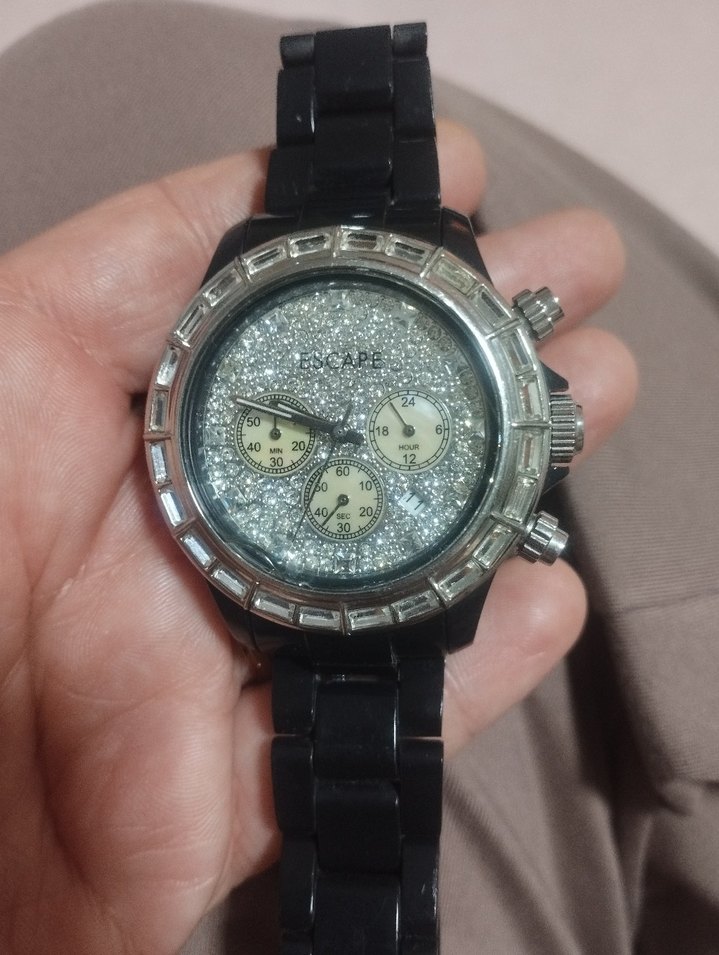Kadın kol saati, parlak siyah kayış ve taşlı kadranıyla göz alıcı rock punk tarzı sunar. Üç küçük kronograf alt kadranı ve sağlam metal çerçevesi bulunur. canı içten çatladı ama kullanıma engel değil sağlam çalışır durumda orjinal saat&saat mağazası ürünü⌚
