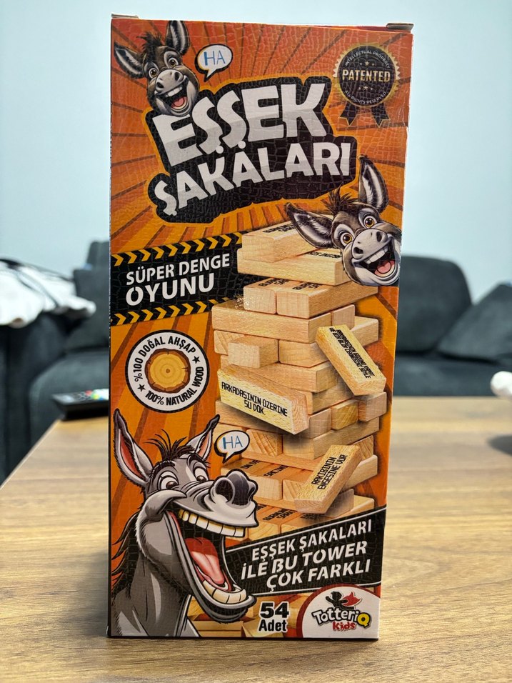 54 parçadan oluşan "Eşek Şakaları" ahşap denge oyunu, süper denge ve eğlence sunar. Ahşap malzemeden yapılmıştır.
