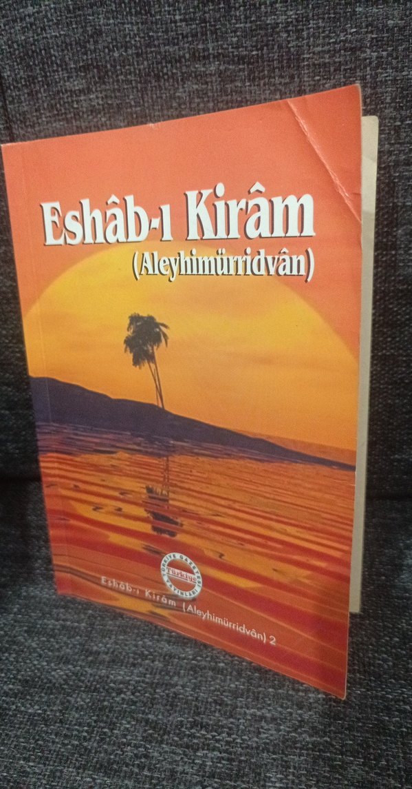 Eshab-ı Kiram (Aleyhimüridvan) başlıklı dini kitap, peygamberin sahabeleriyle ilgili konuları içerir. Kapakta gün batımı, palmiye ağacı ve su yansıması bulunur.