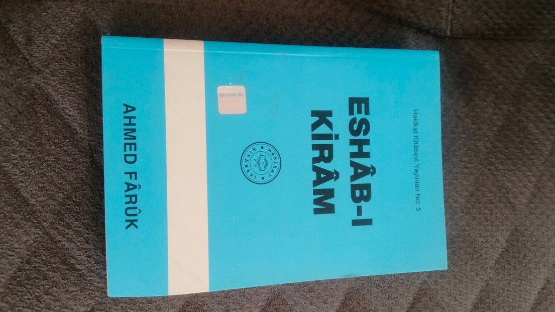 Eshab-ı Kiram adlı dini kitap, Peygamberin sahabeleri üzerine odaklanır. Mavi ve beyaz sade kapaklıdır.