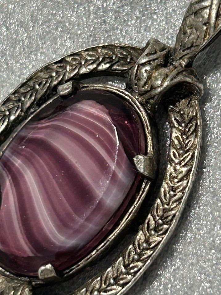 1960’lardan eşi benzeri yok!! Vintage Miracle Pendant Necklace, Scottish Celtic Purple Agate styled Glass #miracle #iskoçya #pendant #cam #murano #1960lardan #celtic NADİDE ÜRÜNDÜR .. .. Mor desenli taşın detaylı zincir çerçevesinde yer aldığı, vintage bohem tarzını yansıtan kadın kolye ucu. Romantik akşamlar için uygun.
