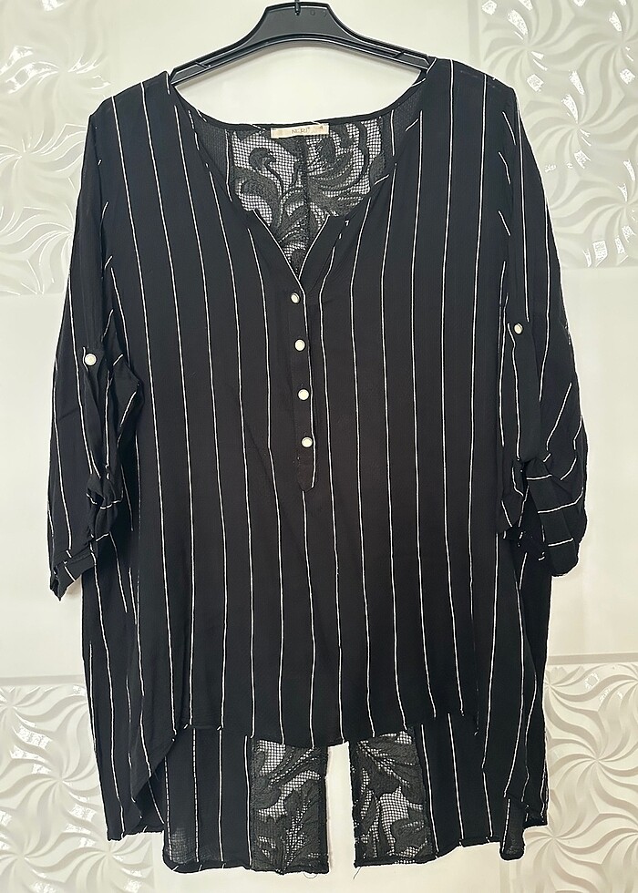Siyah üzerine ince beyaz boyuna çizgileri olan, arka ortası boydan boya dantel, dantel eteğinde yırtmaçlı, kolları kıvrılabilir payetli, yakası yarıya kadar düğmeli, yumuşak tatil triko kumaşlı hem şık hem spor tarzda bluz Eni 62 cm Ön boy 64 cm Arka boy 80 cm