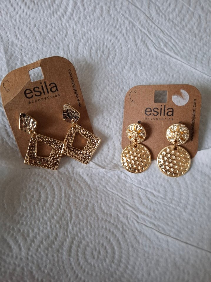 Esila altın renkli, parlak yüzeyli ve baskılı desenlere sahip mini küpeler. Elastik detaylı, bohem düğün tarzına uygun.