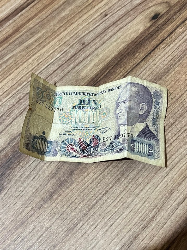 Atatürk portreli, geleneksel desenli eski 1000 Türk Lirası banknotu. Koleksiyonluk hediye olarak kullanılabilir.