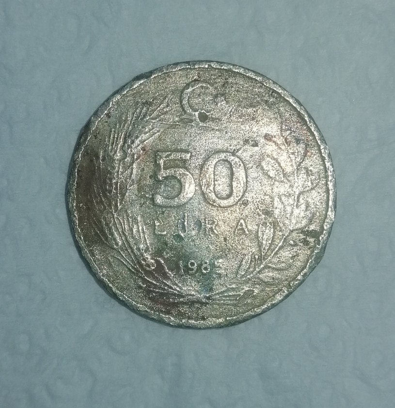 Eski '50 LİRA 1985' tarihli yazılı gri, aşınmış metal bir tasarıma sahiptir. Geleneksel ve eski tarzda. ️