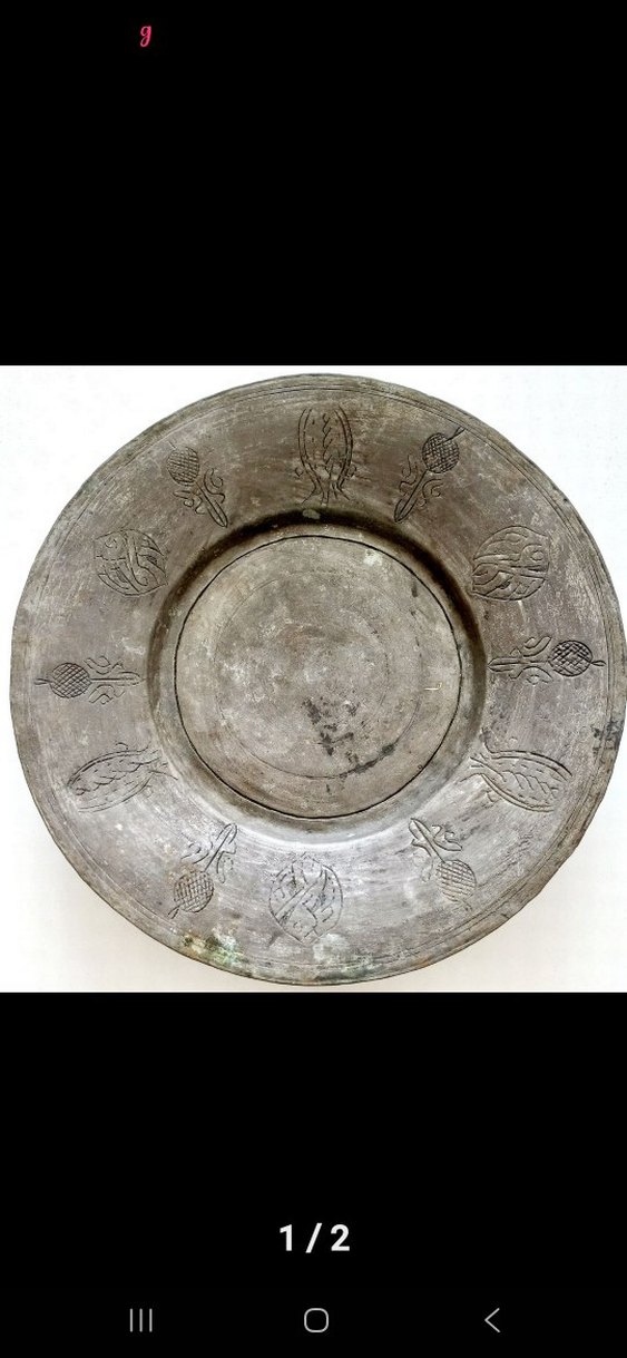 gri renkte, kenarlarında sade işlenmiş desenler bulunan geleneksel tabak. Yüzeyi düzdür ve hafif süslemelere sahiptir. buyuklerimizden kalma kaldırilmıstır. göründügü gibidir.