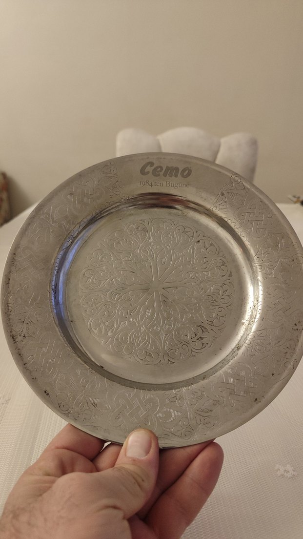Parlak beyaz renkte, işlemeli desenlere sahip tabak. Kenarında 'Cemo' markası yer alır. ️