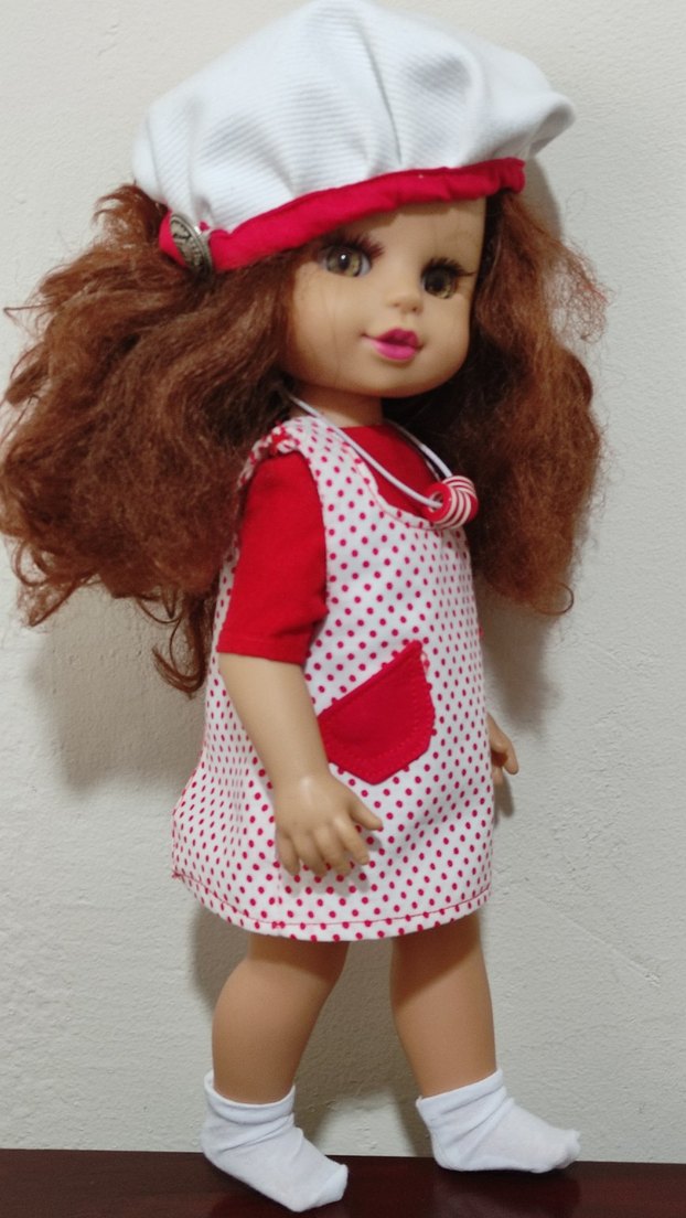 Kıvırcık kahverengi saçlı, kırmızı puantiyeli önlük ve beyaz şapka takan renkli oyuncak bebek.