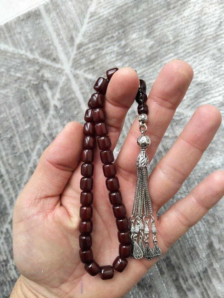 Çekilmiş renk almış koyu renk vişne rengi Sıkma Kehribar, bürokrat boy, gümüş kaplama püskül, 8.5*9 mm ölçülerinde, hatasız eski ürün, şıkır şıkır çekimi ile alana hayırlı olsun