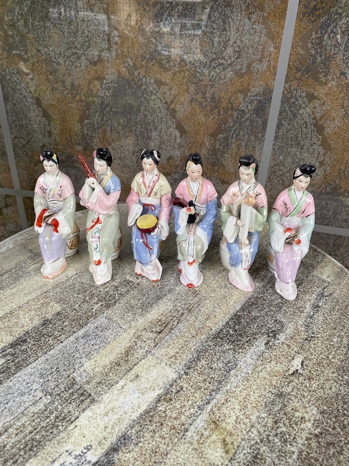 Koleksiyon değeri yüksek oldukça eski damgalı çin porselen takımı Pastel tonlarda, farklı müzik aletleri çalan kadın figürlerinden oluşan set. Her biri farklı poz ve kıyafette.