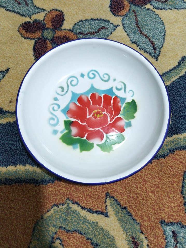Kırmızı çiçek ve yeşil yaprak desenli beyaz tabak. Geleneksel tarzda, mavi kenarlıklı.