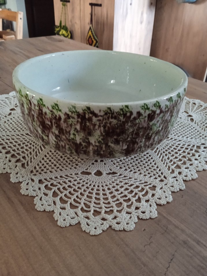 Oldukça eski, Kütahya işi, akıtma boya, derin kase. Ağız kenarında minik atıkları var. Farkedilmeyen şeyler. İç kısmında üretim kaynaklı küçük noktaları var. Çapı 18 cm, yüksekliği 8 cm.Diğer eşi de sayfada satışta.