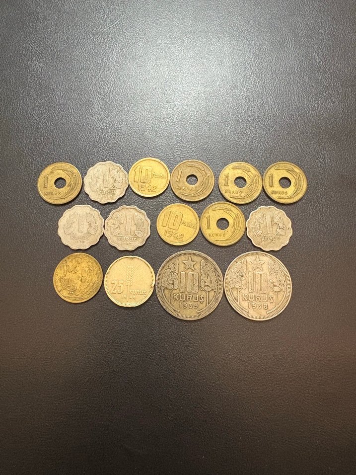 Altın tonlarında, bazıları ortasında delikli yuvarlak tasarımlara sahip vintage erkek rozetleri koleksiyonu. ️