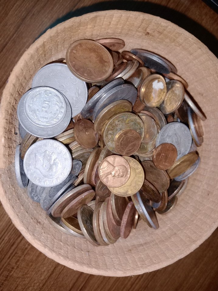 Farklı boyut ve renklerde çeşitli eski metal madeni paralar, dokuma bir sepette yer alıyor.