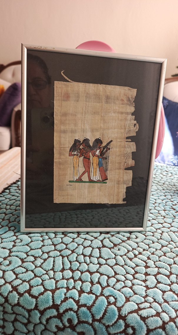 Siyah zemin üzerinde eski Mısır temalı, deve tüyü renginde papirüs üzerine yapılmış üç figürlü tablo. ️