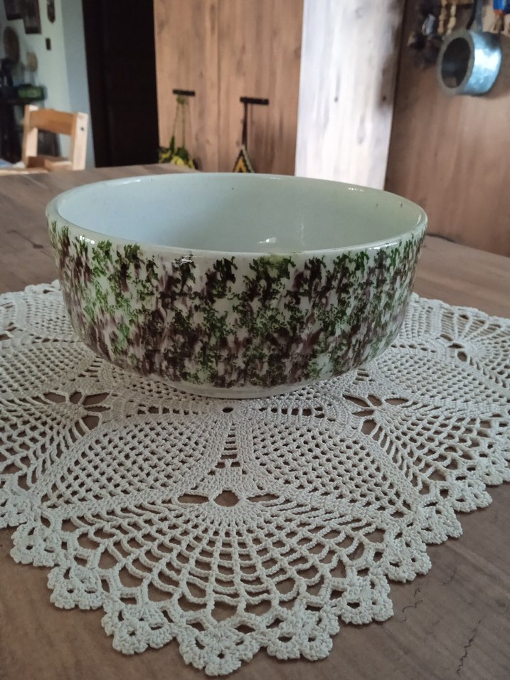 Eski dönem, akıtma boya, Kütahya işi derin kase. Deseniyle ve formuyla güzel bir parça. Ağız kenarında farkedilmeyen minik bir atığı var. İç kısmında da üretim kusuru nokta lekeleri.. Çapı 18 cm, yüksekliği 8 cm. Diğer eşi de sayfada satışta.