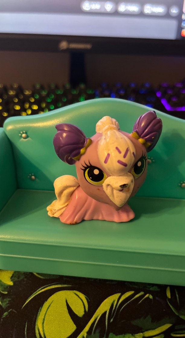 Büyük ifadeli gözlere ve mor detaylara sahip pastel pembe figür oyuncak. Fantastik bir hayvan tasarımına sahip ve neşeli bir ifadeyle tasarlanmıştır.