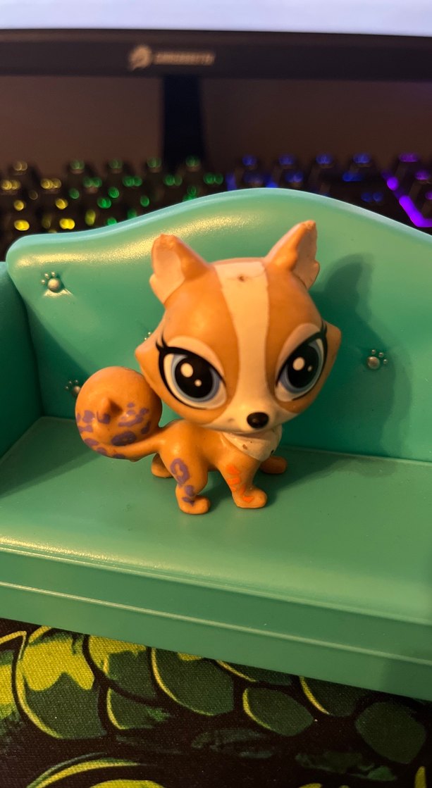 Bej renkte, büyük gözlü ve kıvrık kuyruklu küçük hayvan figürü, turkuaz bir kanepede oturuyor. Üzerinde açık mor desenler var.