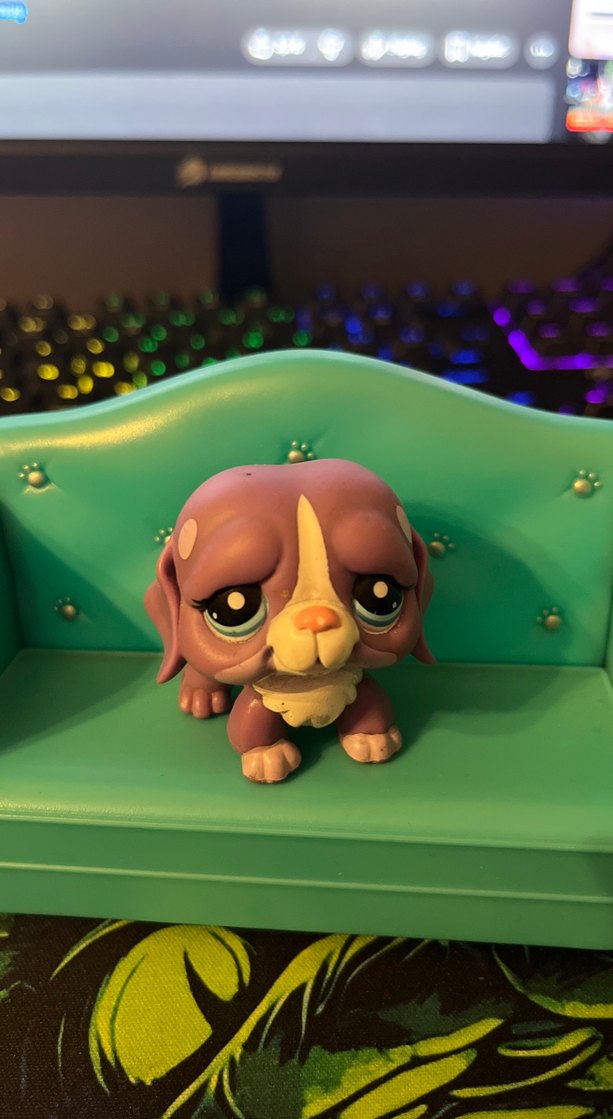 Pastel kahverengi köpek figürü, büyük ifadeli gözler ve detaylı yüz işaretlerine sahip, küçük yeşil kanepede oturuyor.