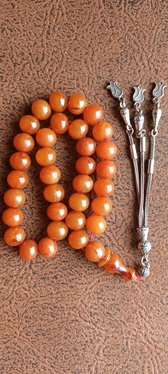 Ortalama 15 yıl kadar önce dökülen fenol kokulu, full hareli, evladiyelik bir orta ayar sıkma kehribar tesbih. Habbe ölçüsü: 10 × 11 mm dir. Alan bin hayrını görsün inşallah.....
