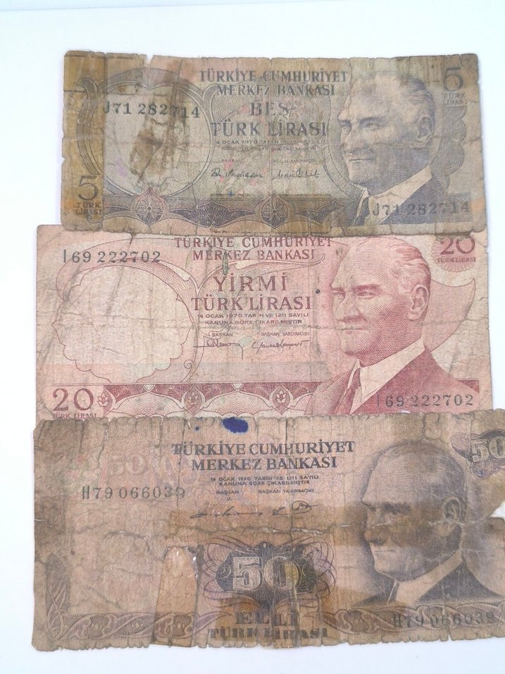 5, 20 ve 50 Türk Lirası değerlerinde eski Türk Lirası banknot seti. 6.Emisyon üç adet orjinal cumhuriyet dönemi banknot yılların izi üzerinde yıpranmış ancak halen canlı fiyat uygun tutuldu koleksiyoncular için ideal çil fiyatları yüksek diyenler için kaçırılmaz fırsat.Lot fiyatıdır.