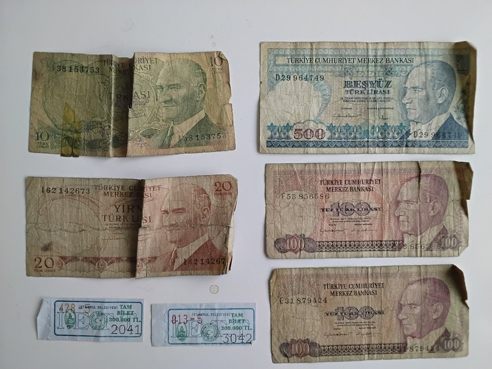 Farklı nominal değerlerde eski Türk Lirası banknotları ve iett biletleri içeren set, 80'li yıllardan.