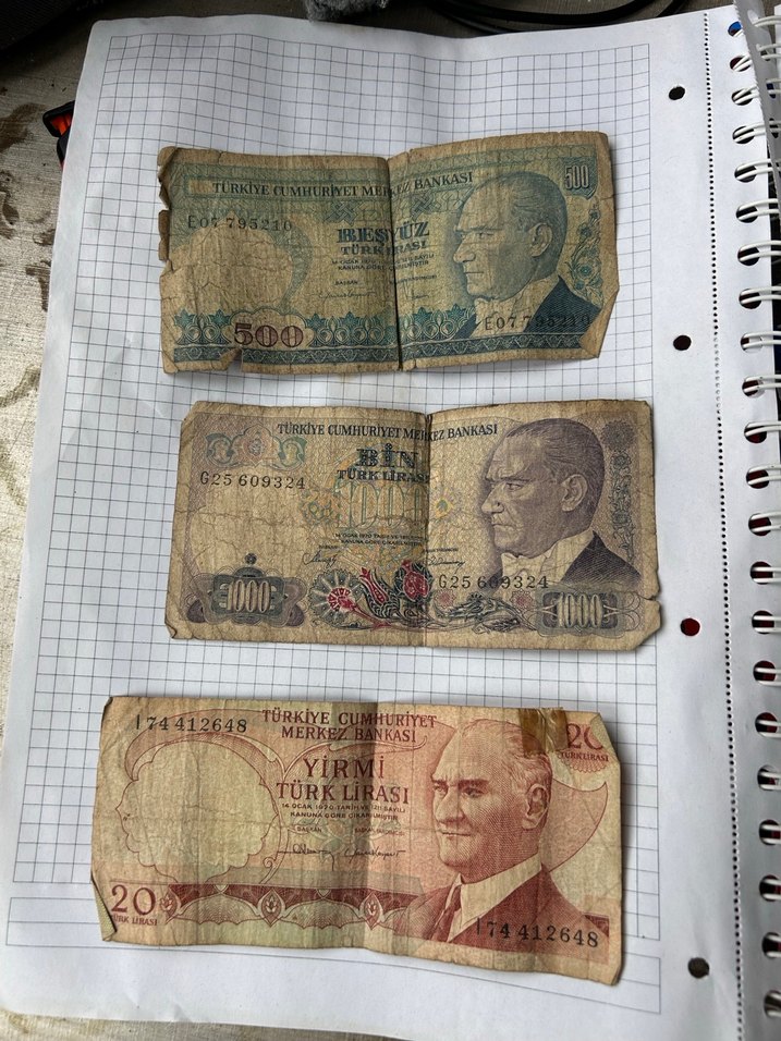 500, 1000 ve 20 Türk Lirası eski banknotlardan oluşan koleksiyon. Her banknot aşınmış ve tarihi tasarım özelliklerine sahip.