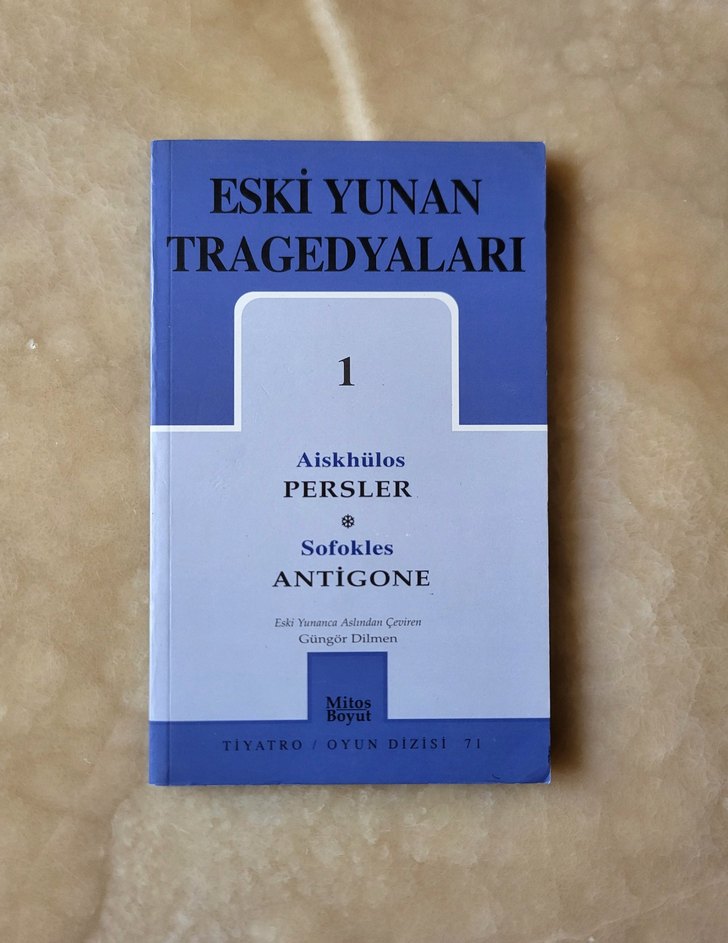 Güngör Dilmen çevirisiyle Aiskhilos'un Persler ve Sofokles'in Antigone eserlerini içeren Osmanlıca eski Yunan tragedyaları kitabı.