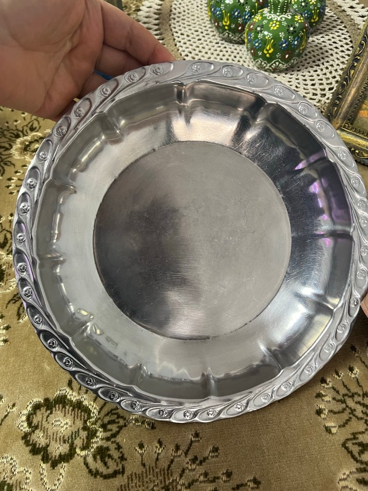 Parlak gümüş renkte, klasik tarzda, metalden yapılmış dekoratif kenarlı tabak. ️