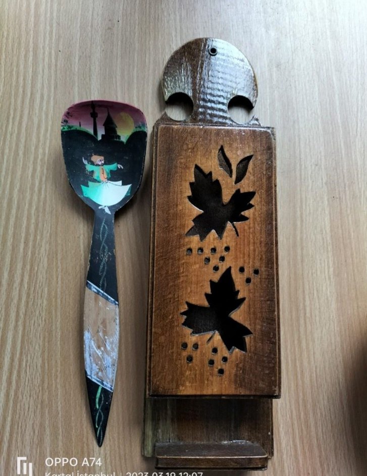 Koyu kahverengi ahşap desenli oyma kibrit kutusu. Yaninda Konya tahta kaşık hediye!! Boyu 30 cm. Eni 8 cm.