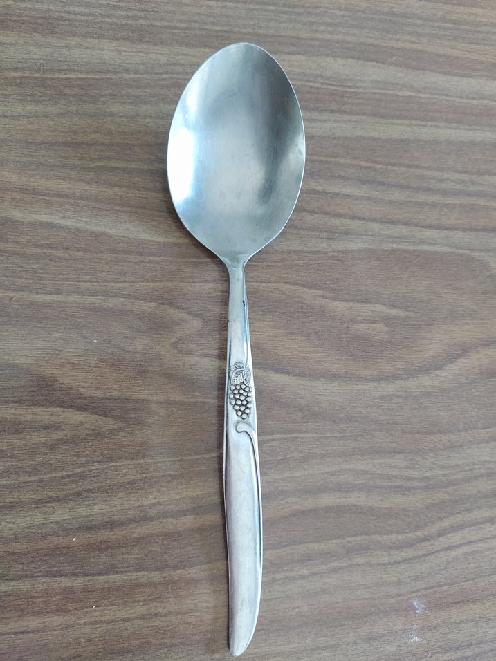 Bej saplı gri metal kaşık, sap kısmında üzüm desenine sahiptir.