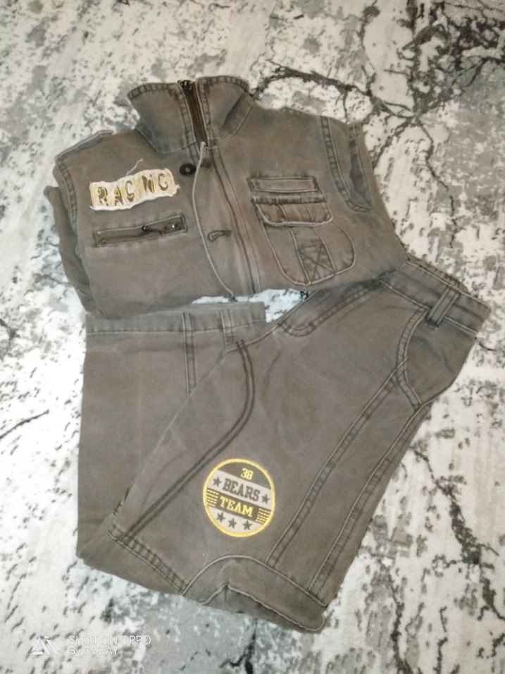 Haki-Kahverengi arası denim biker tarzı erkek çocuk takımı, düğmeli fermuarlı kot ceket işlemeli detaylara sahip. Takım, patch detaylı pantolon içerir.Beli içten lastik ayarlıdır. ️temiz defosuz. Marka temsilidir kaliteli kumaşı olan bir takımdır