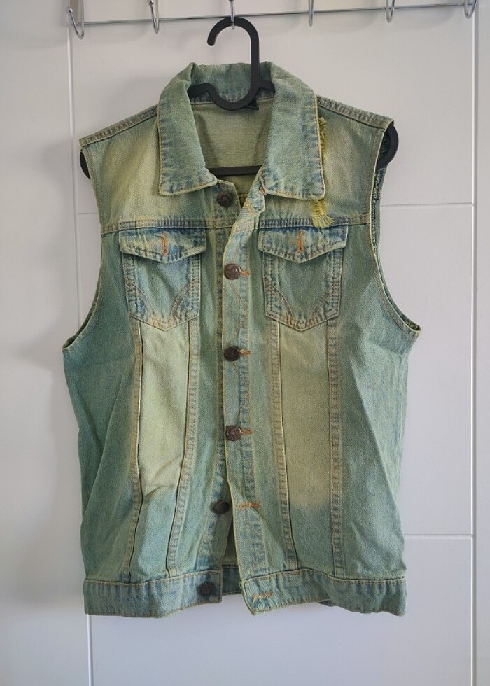Mavi Yeşil Tonlarda Eskitme Kot Yelek