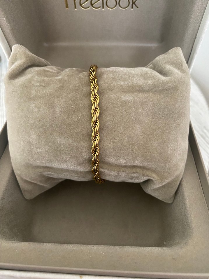 Esnek yapıya sahip altın renkli kadın bileklik, desen içermeyen çağdaş ve klasik şıklık sunar. Gri yastık üzerinde, rahat ve zarif görünür.✨