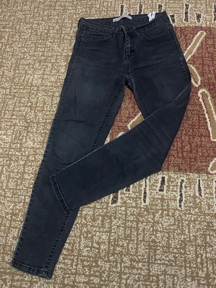 Yanları simli detaylı koyu gri esnek jean