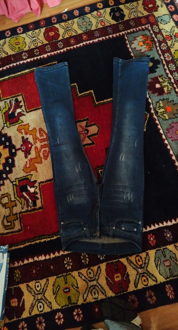 Bu lacivert kot pantolon, sıkı kesim ve midi boyda, batik desenlidir. Tokalı detaylarıyla günlük sokak stiline uygundur.