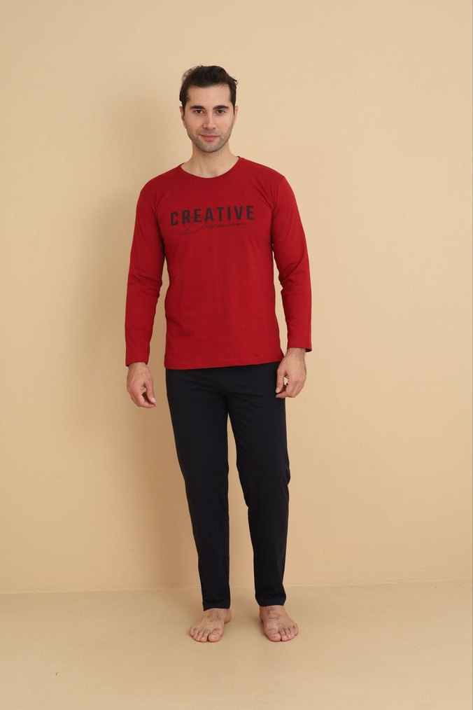 Koyu kırmızı, uzun kollu, yuvarlak yaka üstte CREATIVE baskısı bulunan, normal kesim rahat erkek pijama takımı. Sokak stiline uygun şık tasarım.