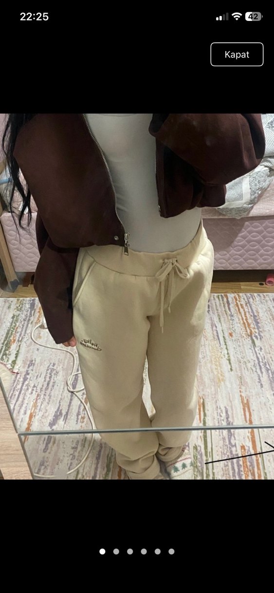 Çok güzel bir eşofman ecrou dan aldım bir ili kere giyildi sadece eşofman giymediğim için satıyorum beli kalın lastikli içi pamukludur bir sorunu yoktur