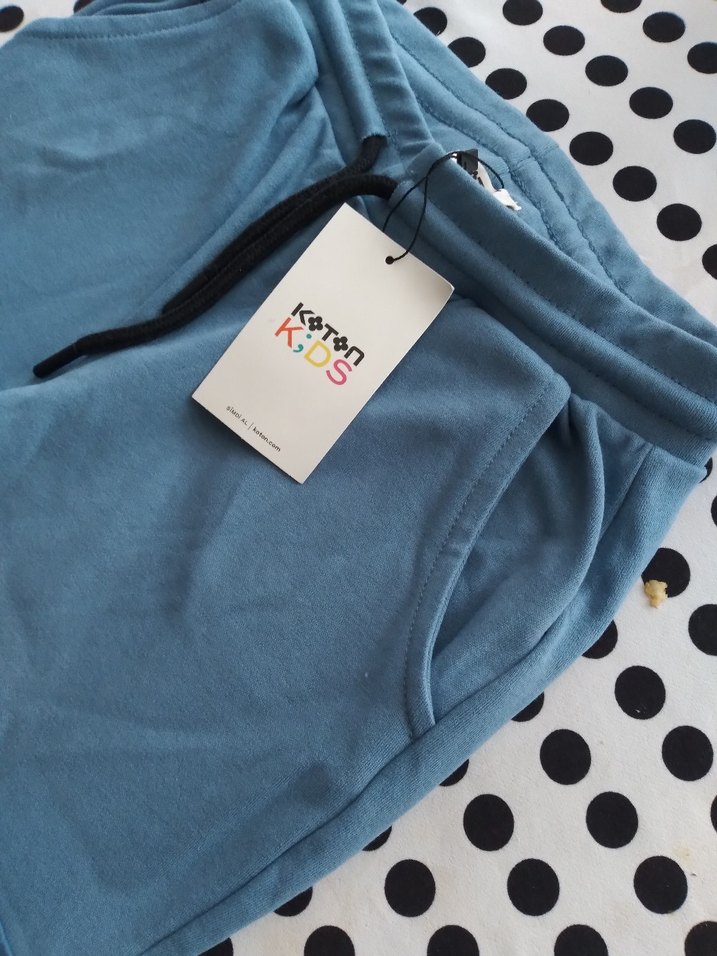 Mavi renkli, baskılı desene sahip 2 yan cep altta 1 cep belinde lastik ve ipi var paça lastik li orjinal koton 116 122 cm