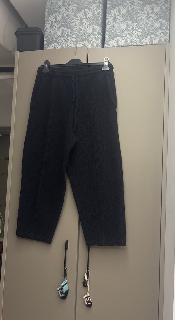 Siyah, rahat kesim midi boy kadın eşofman altı. Yumuşak ve sıcak kumaş, gündelik sokak stili için uygun. Rahat ve şık kullanım sağlar. Bedeni L ancak XL için de rahat olur.
