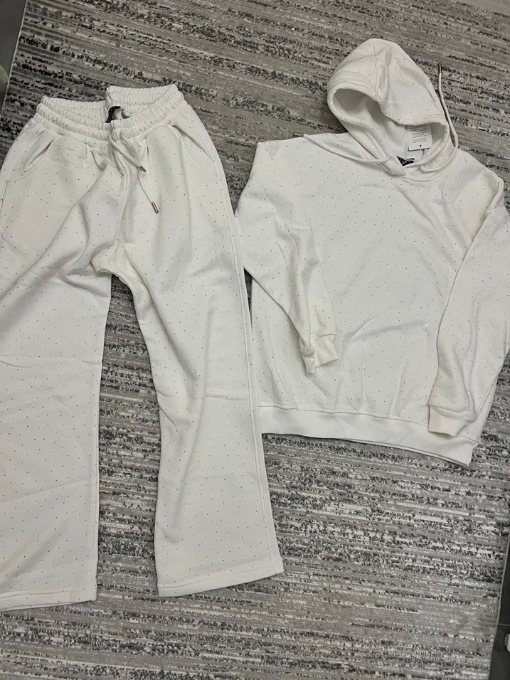 Kadınlar için pamuklu, uzun kollu ve kapüşonlu, bol kesim beyaz eşofman takımı. Beyaz detaylarla günlük rahat ve şık bir görünüm sunar. Taş detaylı M beden bir sorunu yoktur sıfır etiketli ürün çok şık ürün taşta düşme yapmaz