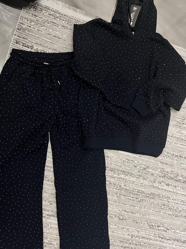 Kadın lacivert eşofman takımı, bol kesim ve uzun boylu, sentetik kumaştan taşlı ışıltılı detaylarla. Kapüşonlu üst ve uzun kollu, günlük rahat stil için uygun. ✨ Takım üründür sıfır ürün M beden bir sorunu yoktur yeni girişimciyim S m l bedenleri de ayrı ayrı mevcuttur koyu lacivert rengi taşta asla düşme yapmaz