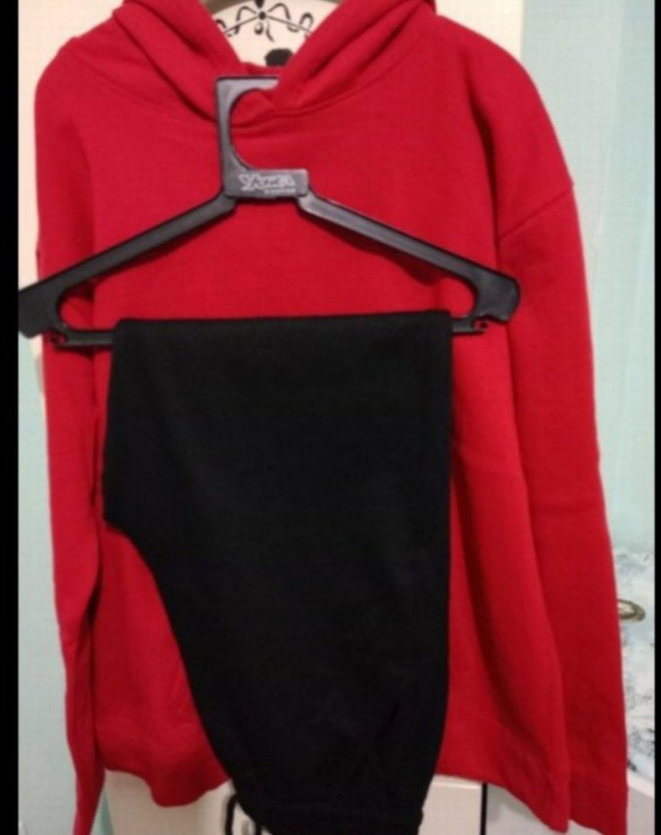 Kırmızı ( bordoya yakın bir kırmızı, rengi ışığın etkisiyle böyle çıktı. Bu denli parlak değil) uzun kollu, kapüşonlu eşofman takımı. Günlük kullanım için düz ve sade tasarıma sahiptir. Ölçüleri; (üst kısmın) en 60, boy 68 kol boyu 60 cm'dir. Alt kısmın ise; boy 100 bel lastikli esnetilmeden 72 cm'dir. Yandan cepli ve paçası lastiklidir. Herhangi bir sorunu bulunmamaktadır.