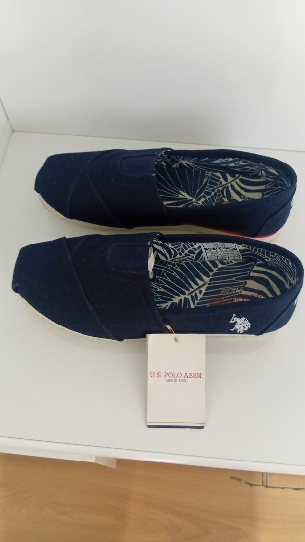 U.S. Polo Assn. marka, lacivert renkli, baskılı iç tabanlı, velcro bantlı espadril. Kauçuk tabanlı, günlük sokak stili için uygun.