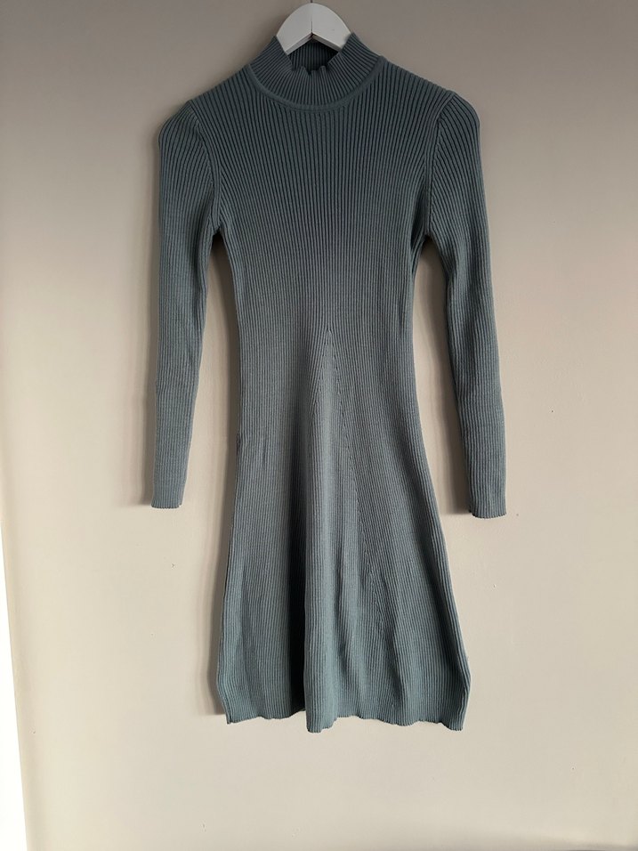 Kadın gri triko elbise, yüksek yakalı ve uzun kollu. Vücuda oturan kesimi ve midi boyu ile rahat ve şık bir günlük tercih. boy 95cm gogus 36cm 60cm e kadar esneyebiliyor