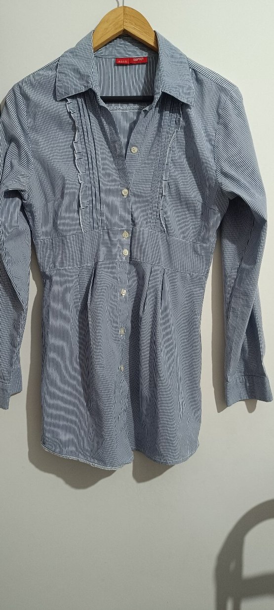 vintage Espirit m beden mavi beyaz çizgili gömlek,tunik düğmeli önde ve yakalı tasarıma sahip, ve uzun kolludur. Midi boyu günlük şıklık için uygundur.