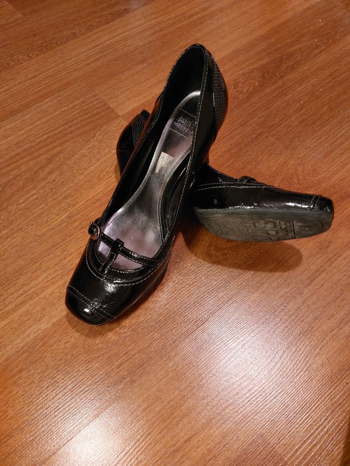 Siyah renkli, tokalı klasik kadın ayakkabısı. Lastik malzemeden üretilmiş, kalın topuklu ve gotik tarzda, ofis kullanımı için uygundur.