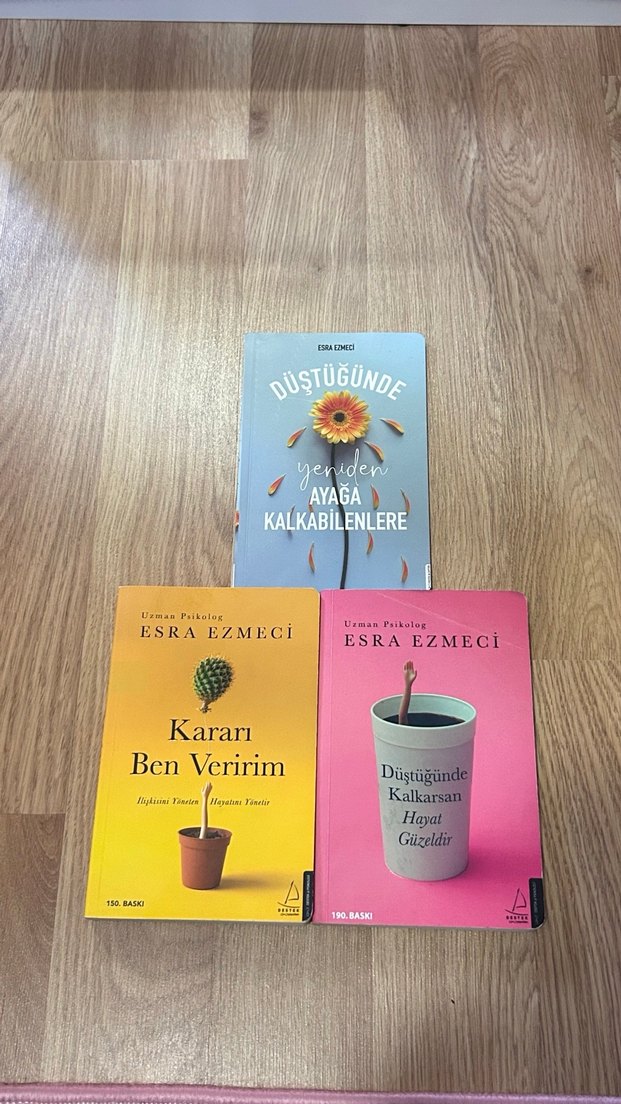 Psikolog Esra Ezmeci'nin 'Düştüğünde Kalkarsan Hayat Güzeldir' ve 'Kararı Ben Veririm' kitapları, dayanıklılık ve hayat yönetimi üzerine. Defter Hediyelidir iç kısmında deformesi var görsele eklendi kullandığım sayfaları da sildim 7-8 sayfa dışında temiz