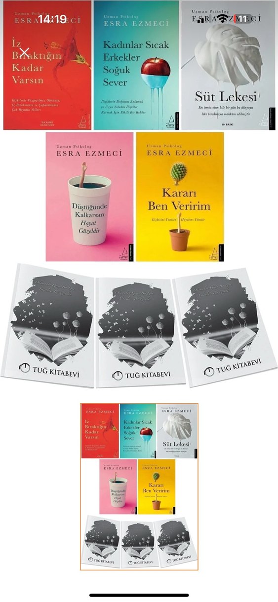 Esra Ezmeci'nin 'Düştüğünde Kalkarsan Hayat Güzeldir' ve 'Kararı Ben Veririm' kitaplarını içeren üniversite kitap seti. 5li kitap